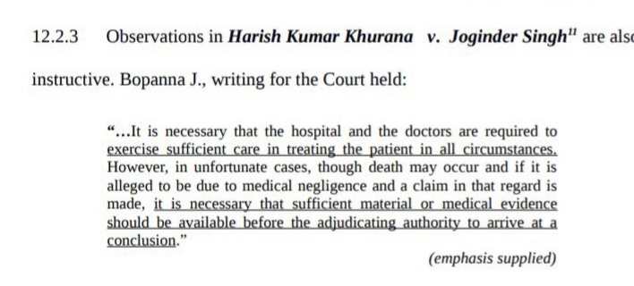 Dr. Harish Kumar Khurana v. Joginder Singh, (2021) 10 SCC 291 held, hospital and doctors are required to exercise sufficient care in treating patients in all circumstances. However, in an unfortunate case, death may occur. It is necessary, sufficient material on medical evidence is available to conclude: death is due to medical negligence.